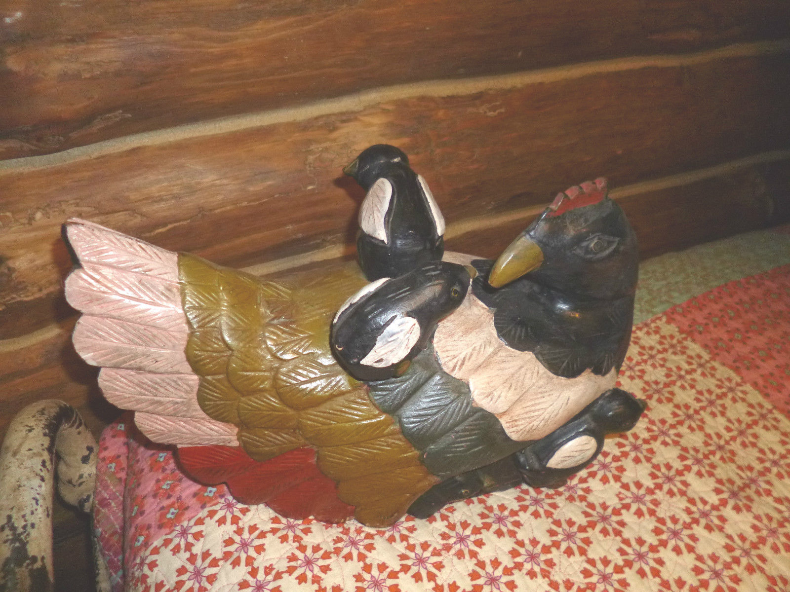 Antique Oak Hen & Chicks Primitive Hand Carved Wood Folk Art