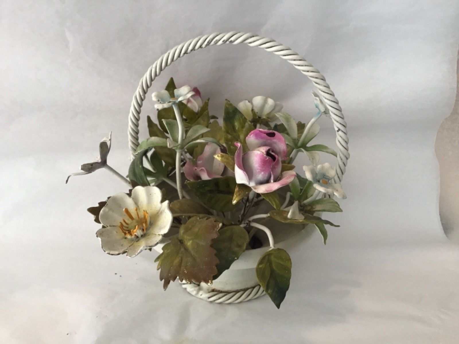 Title (ebay affiliate link): Vintage shabby chic toleware enameled metal flower basket and flowers