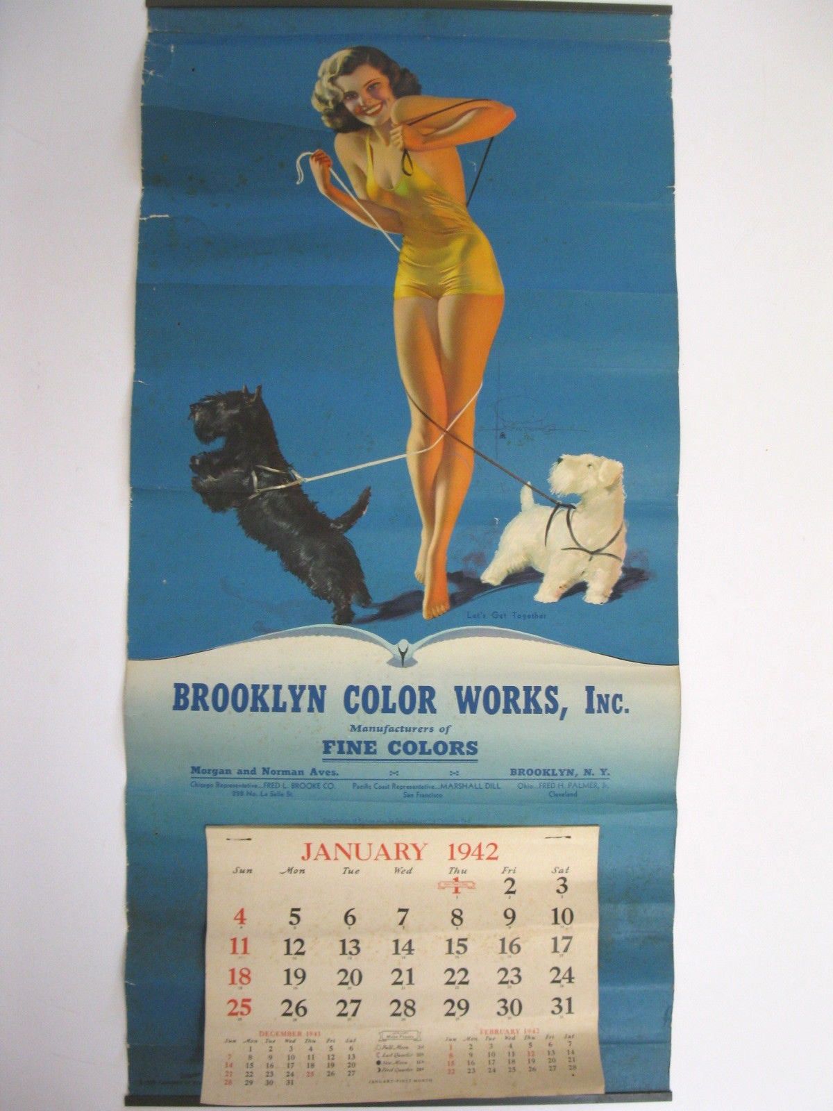 Title (ebay affiliate link): 1942 Brooklyn Color Works INC Advertising Pin-up Calendar Let''s Get Together