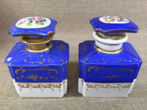 Title (ebay affiliate link): Pair Old Paris Porcelain Blue Gold Flowers Dresser Powder Jars Unusual Design