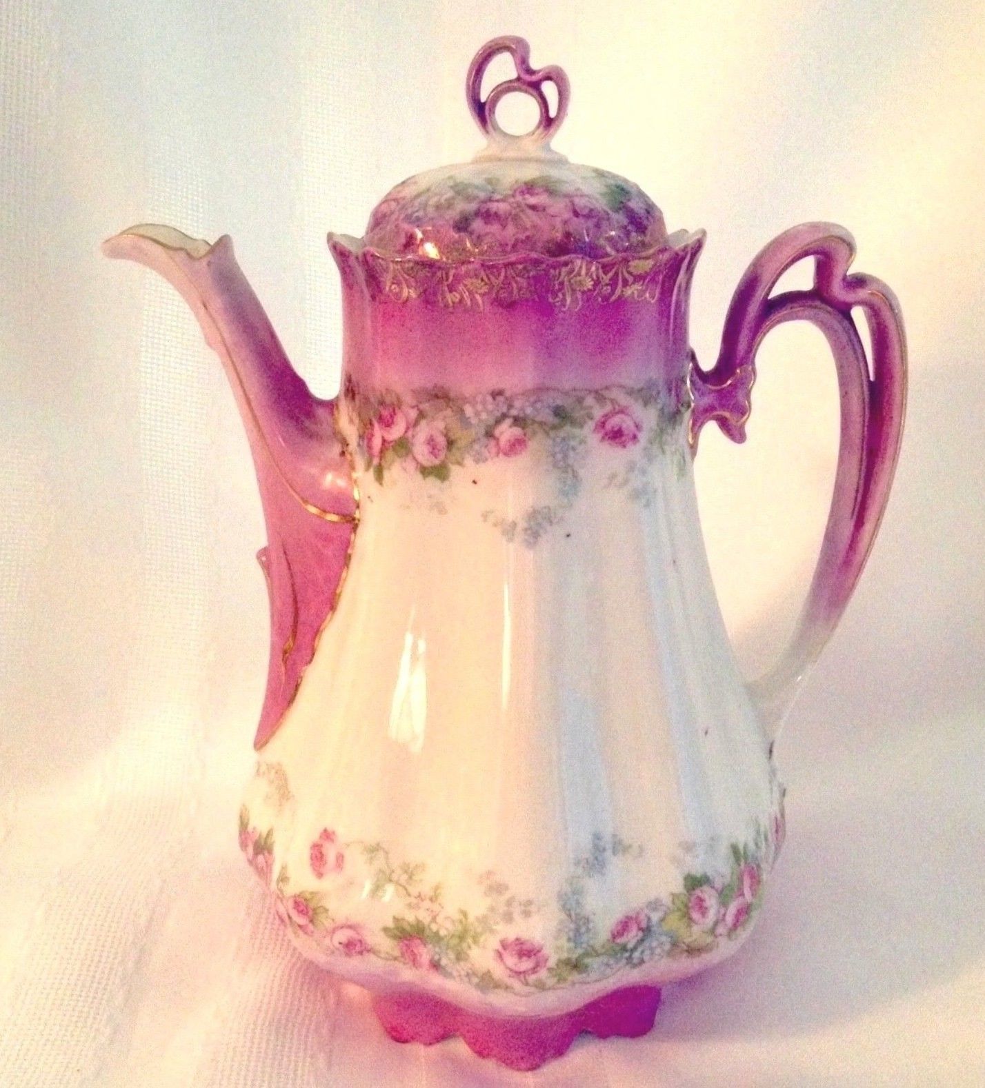 Title (ebay affiliate link): Antique Porcelain Chocolate Pot, Coffee Pot, Teapot w/Pink Roses Gold Stenciling