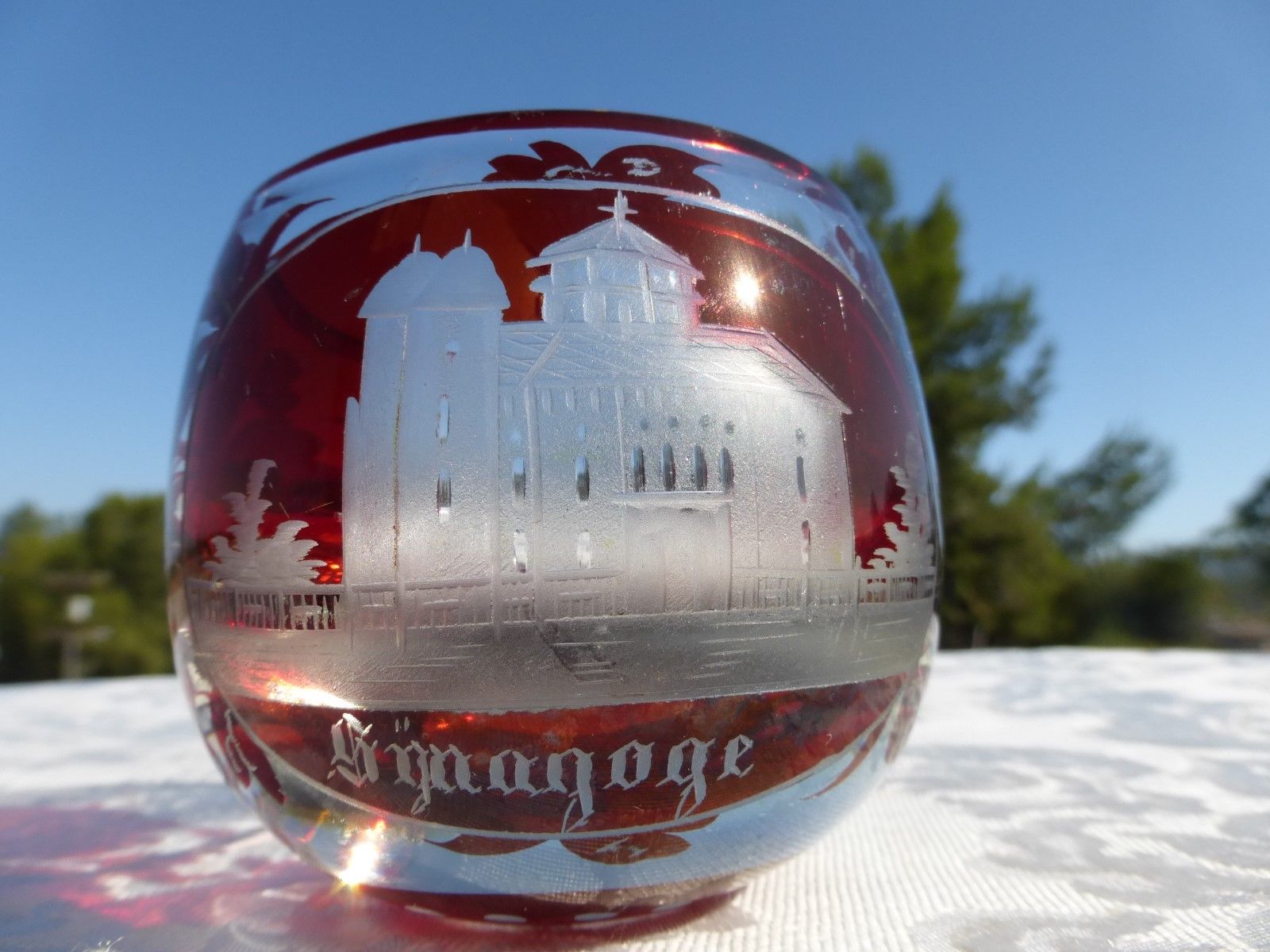 Title (ebay affiliate link): ANTIQUE VICTORIAN Red CUT TO CLEAR Glass of a European Synagogue AMAZING