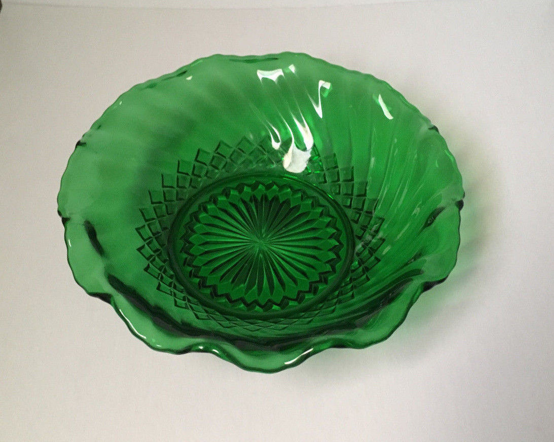 Vintage Depression Glass Bowl Dish Forest Green Diamond Pattern Ruffled Edge