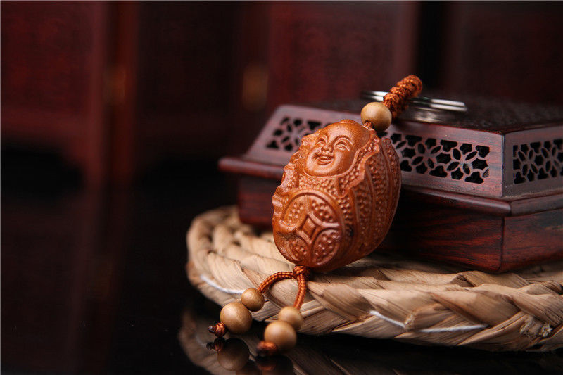 Title (ebay affiliate link): Wood 3D Carving Chinese Happy Buddha Statue Lotus Leaf Coin Pendant Key Chain