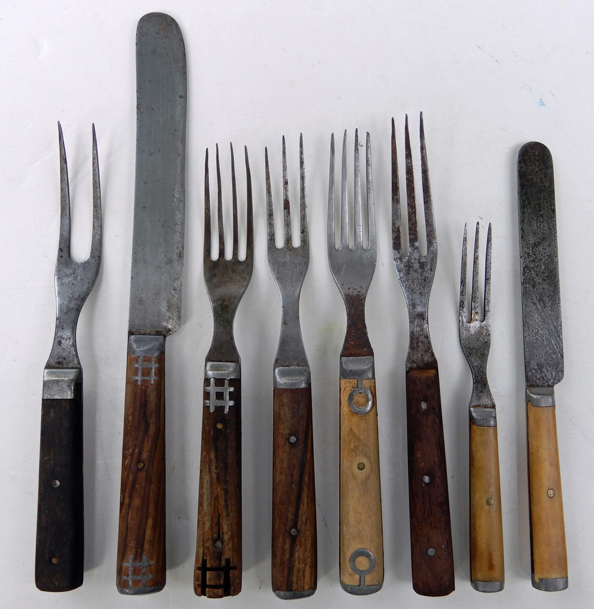 Antique Flatware Eating Utensils Civil War Era 8 Pieces Knife Fork Inlaid Handle