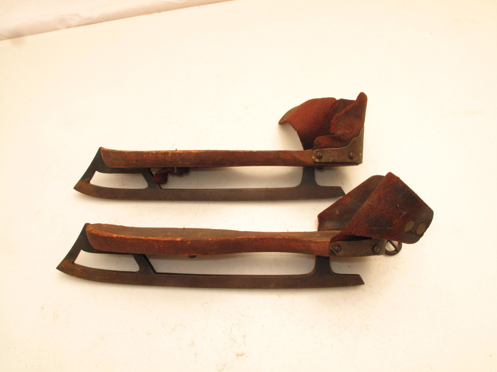 Title (ebay affiliate link): ANTIQUE PRIMITIVE WOOD ICE SKATES HAND FORGED CURVED IRON BLADES LEATHER
