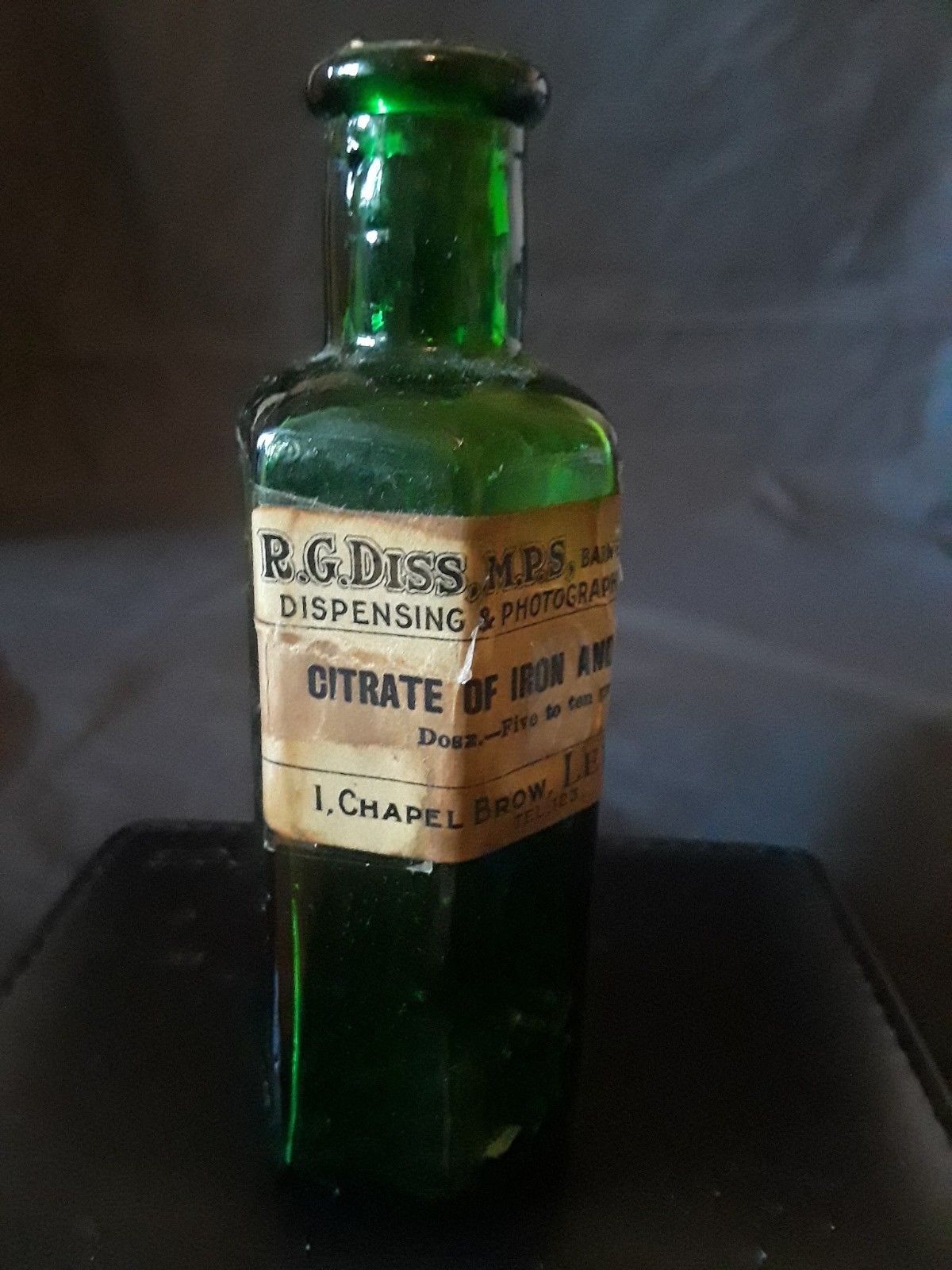 Title (ebay affiliate link): Antique English medicine bottle - Green Citrate of Iron and Quinine