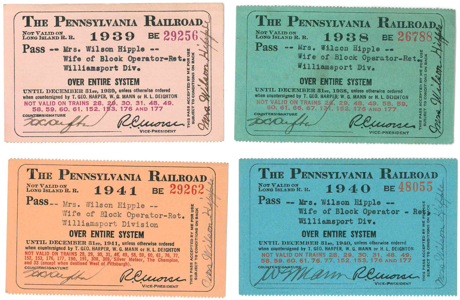 Title (ebay affiliate link): 1938-1941 Pennsylvania RR system-wide passes Mrs. Wilson Hipple Perry Co PA