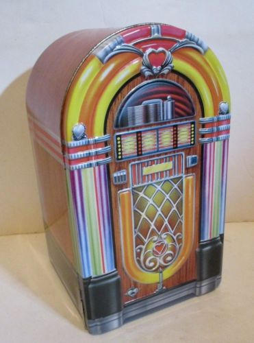 Title (ebay affiliate link): RETRO 1950''S STYLE JUKEBOX SHAPED HINGED FRONT LID TIN 6.5"X11"X6"