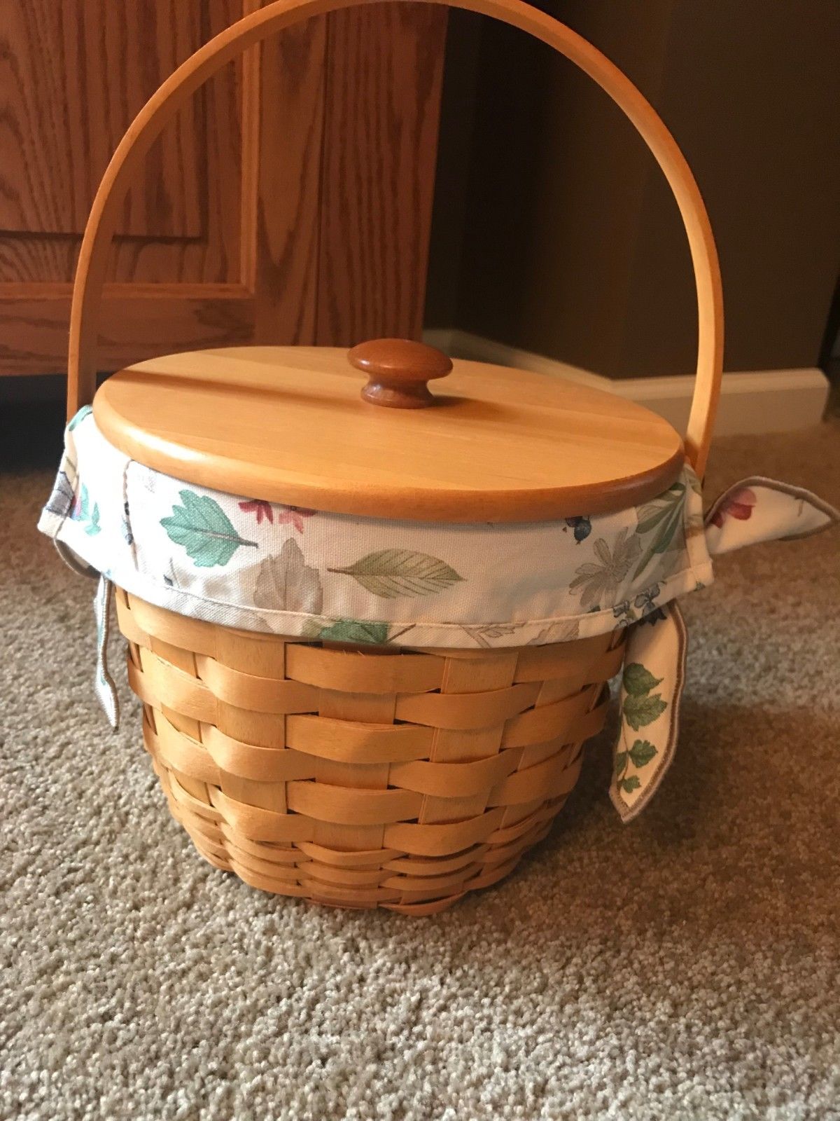 Title (ebay affiliate link): Longaberger Fruit Basket, WoodCrafts Lid, Botanical Fields Liner & Protector