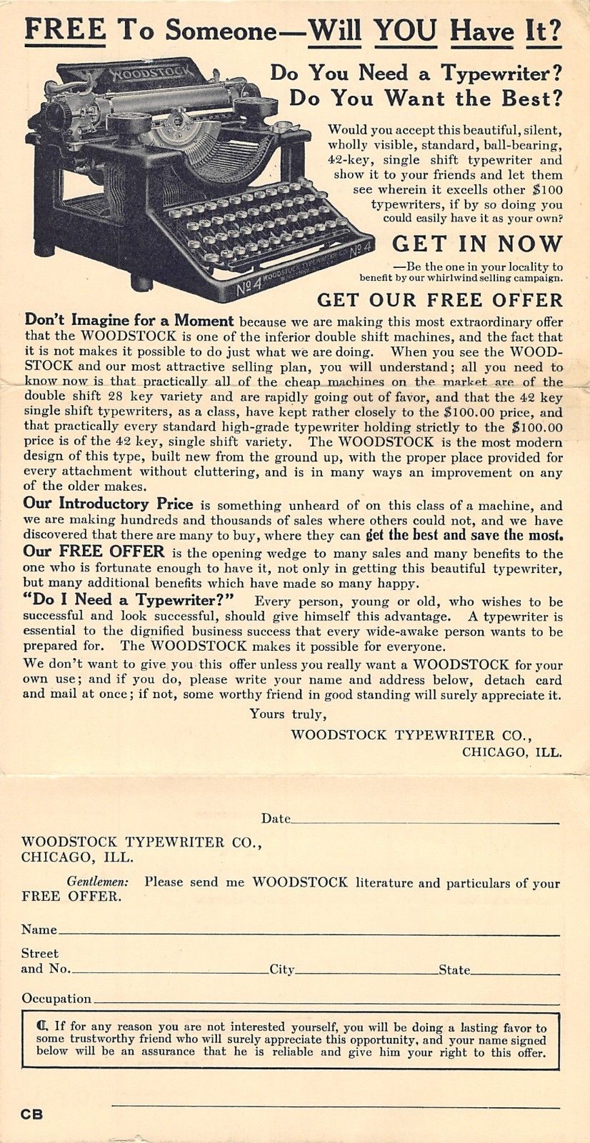 Chicago IL Woodstock Typewriter~Free Offer Postal~But Wait There is a Catch 1920