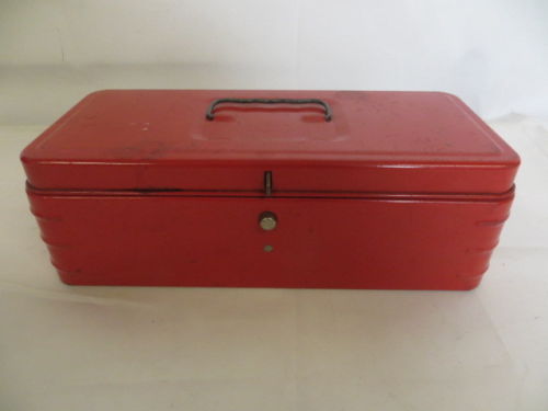 Title (ebay affiliate link): Vintage DEAN PHIPPS STORES Red Metal Tool Box w/ Push Closure Pat No. #1912915