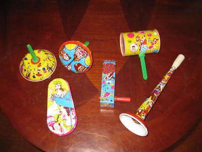 Lot of 6 Vintage Tin Noise Makers by US Metal Toy Mfg.