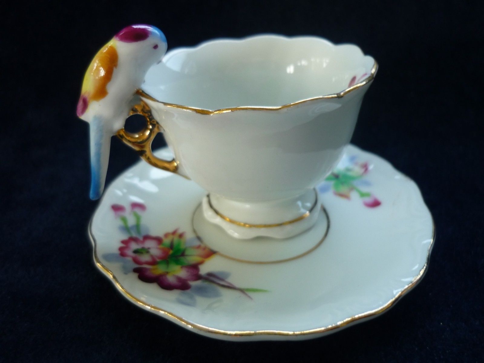 VINTAGE HAND PAINTED DEMITASSE CUP & SAUCER WITH PARROT HANDLE