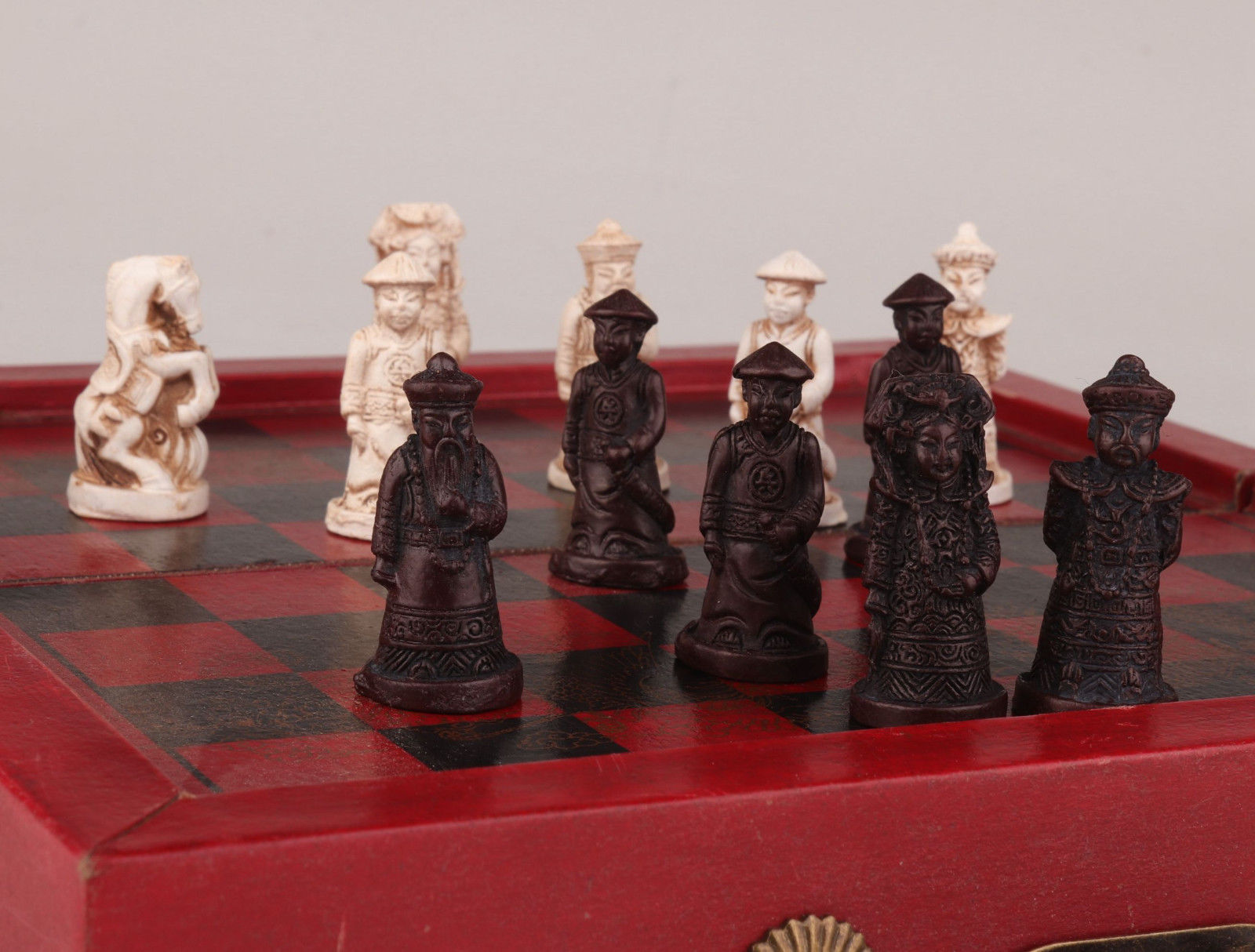 RED LEATHER BOX OLD RESIN CHESS DRAGON GAME COLLECTION VINTAGE