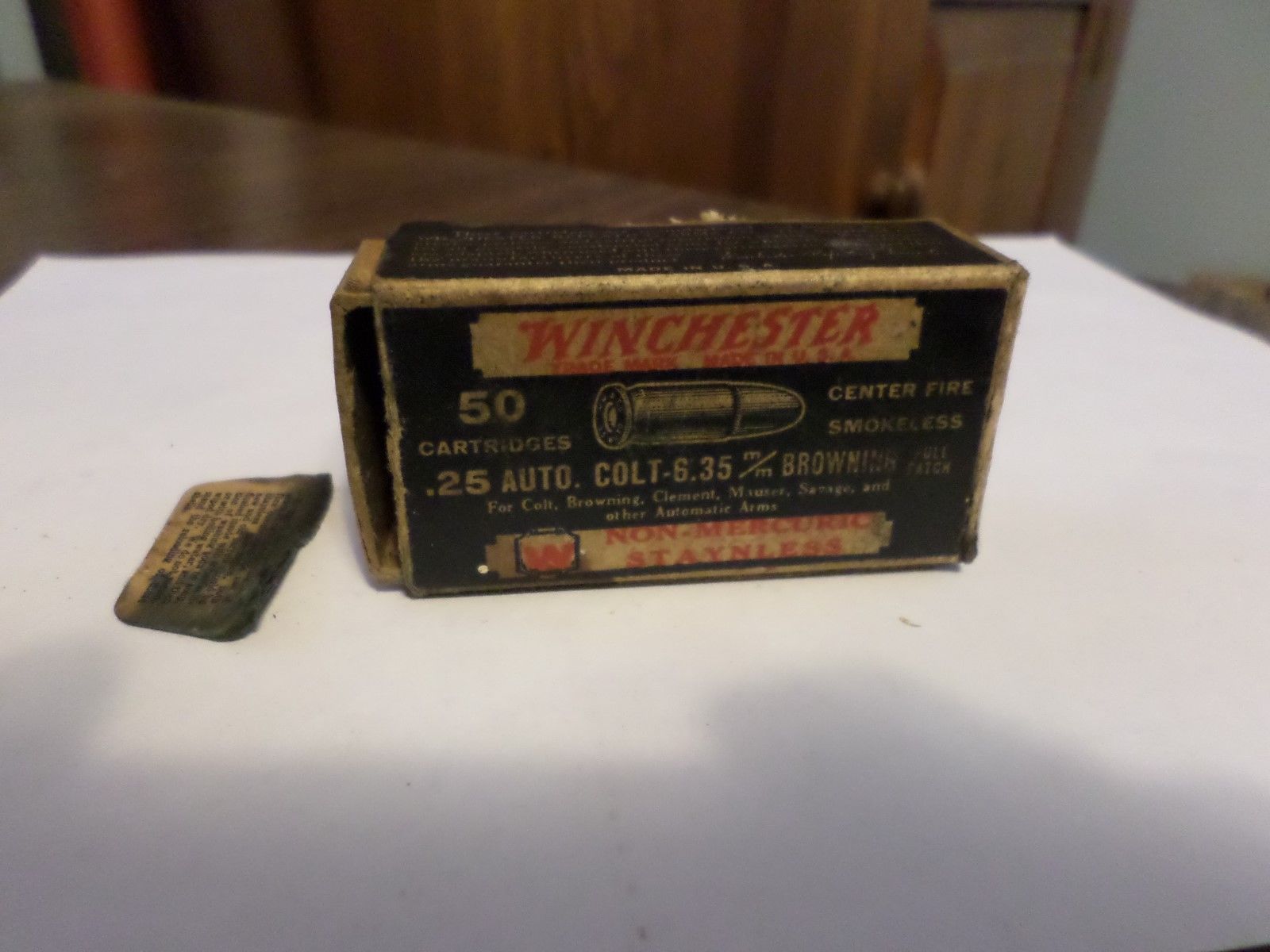 Title (ebay affiliate link): Vintage .25 Auto Winchester Colt Ammo Box 50 centerfire Non Mercuric Staynless
