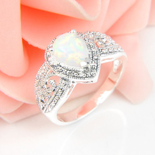 MOM Gift Antique White Drop Fire Opal Gems Silver Plated Ring #7