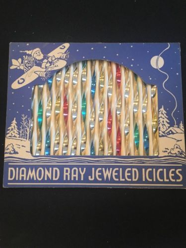 Title (ebay affiliate link): VINTAGE DIAMOND RAY JEWELED TWISTED ICICLE CHRISTMAS ORNAMENTS ORIG BLUE BOX