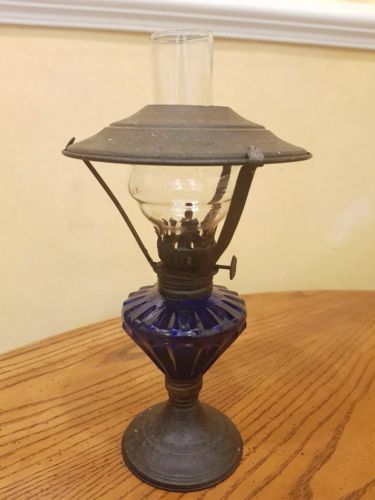 Title (ebay affiliate link): Vintage Paraffin Oil Burner Lamp with Blue Flutted Design Glass Reservoir
