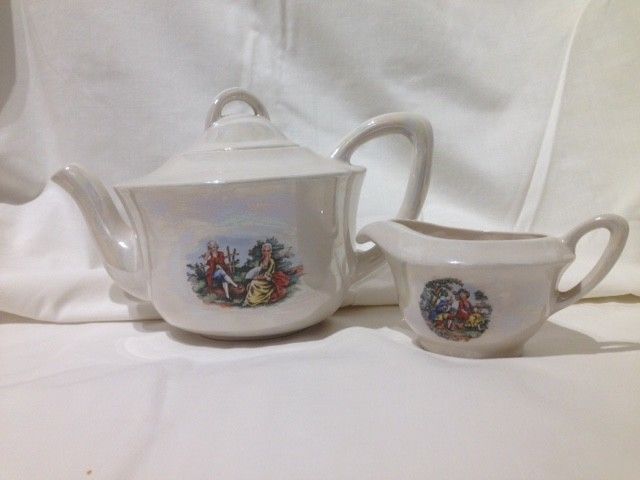 Title (ebay affiliate link): Simple, elegant, irredescent bone china teapot with Victorian courting couple