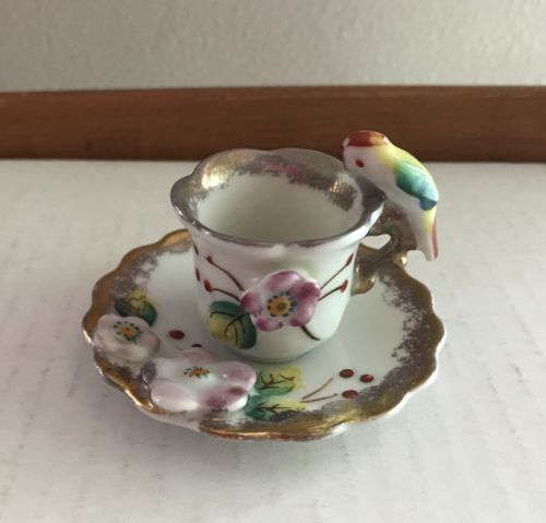 Title (ebay affiliate link): Mini Tea Cup & Saucer SPHINX Floral Theme PARROT HANDLE 2" tall Made in Japan