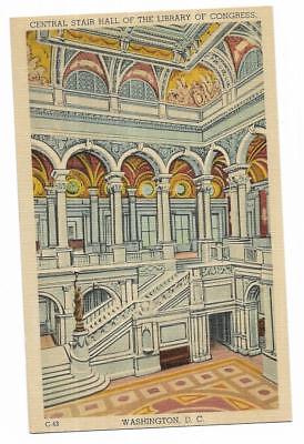 Vintage Washington DC Linen Postcard Central Stair Hall Of The Library Congress