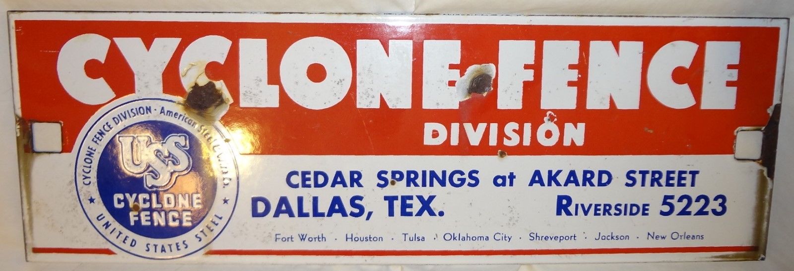 Vintage USS Cyclone Fence Div. Sign Porcelain Enamel Dallas, Texas