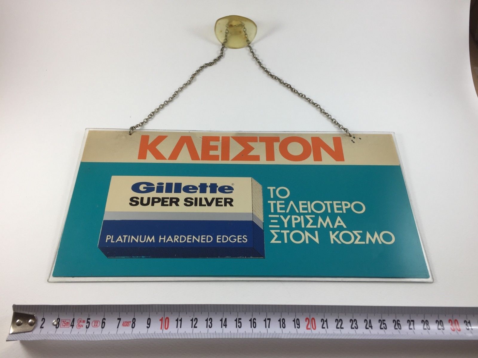 Title (ebay affiliate link): VINTAGE NOS GILLETTE SUPER SILVER OPEN & CLOSED DOOR SIGN (GREEK)
