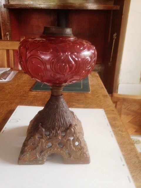 Title (ebay affiliate link): Victorian oil lamp cast metal pierced base with cranberry font