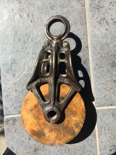 Title (ebay affiliate link): VINTAGE ANTIQUE CAST IRON & WOOD BARN HAY PULLEY PRIMITIVE FARM TOOL OLD PRIM