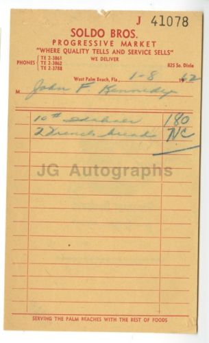 Title (ebay affiliate link): John F. Kennedy - Original 1962 Receipt for Food from Soldo Bros.