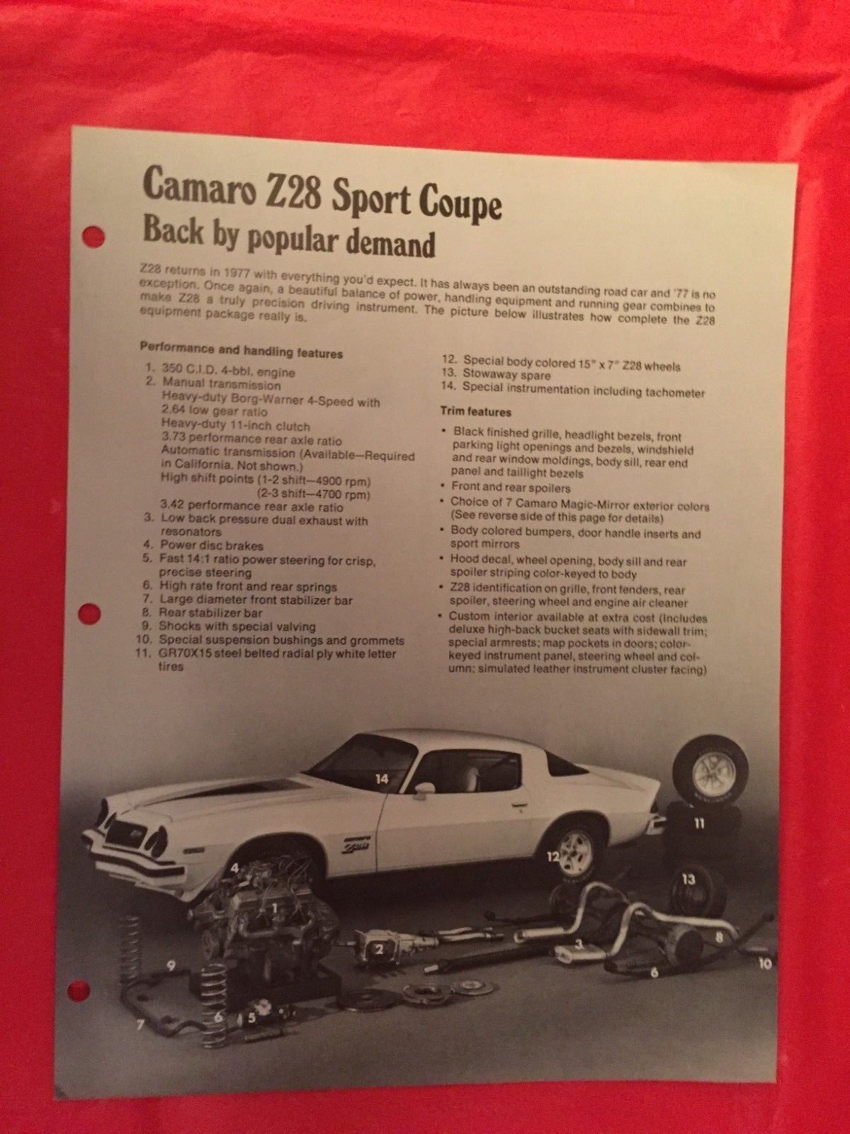Title (ebay affiliate link): 1977 Chevrolet "Camaro Z28 Sport Coupe" Car Dealer Sales Brochure