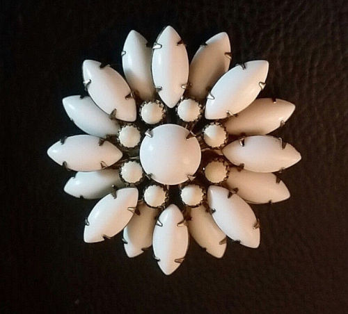 Title (ebay affiliate link): VTG RHINESTONE BROOCH Silver Plated Milk Glass Flower Pin JULIANA ?