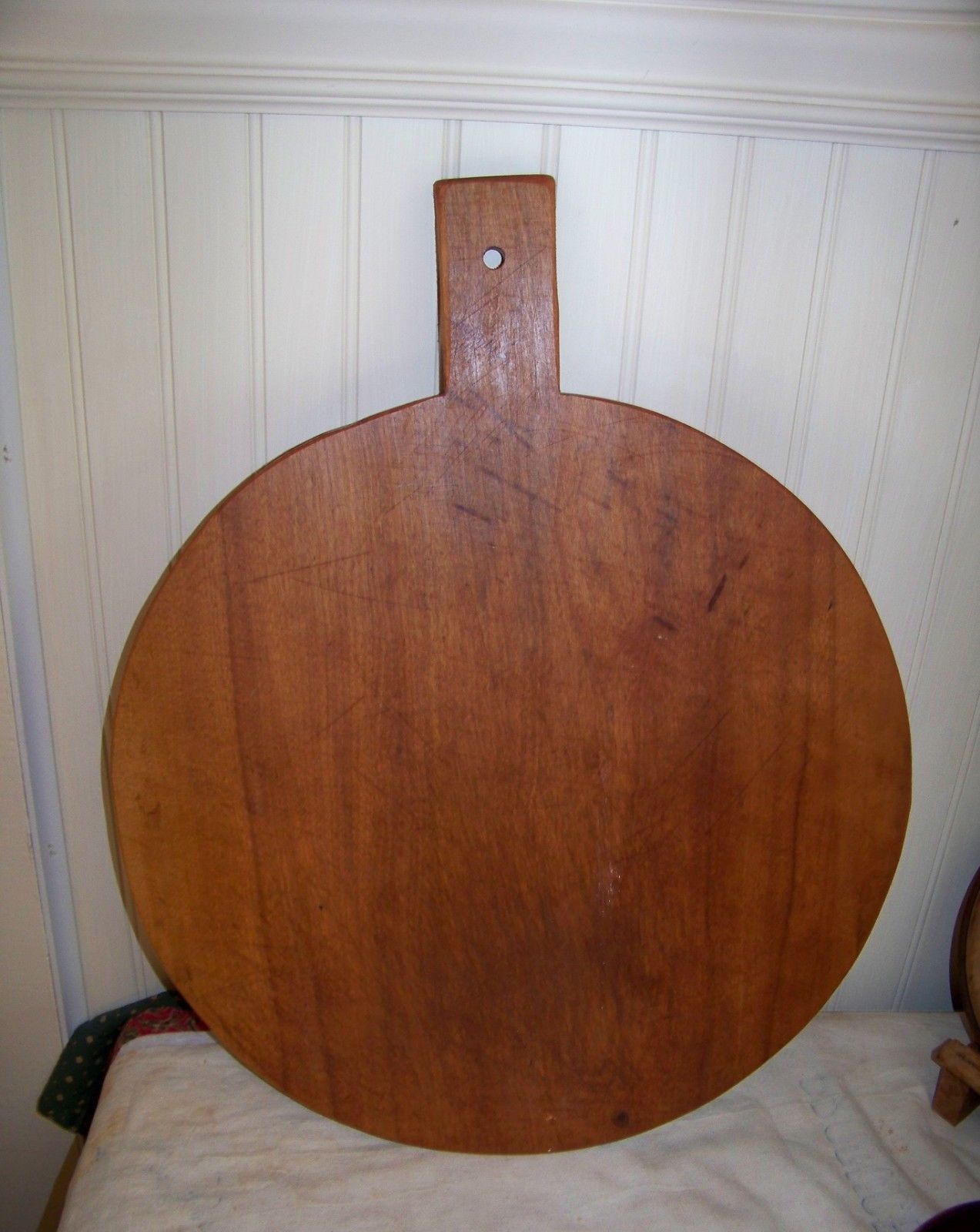 Title (ebay affiliate link): Primitive LG Round Vintage Wood Pastry Bread or Cutting Board w/ Stains & Cuts