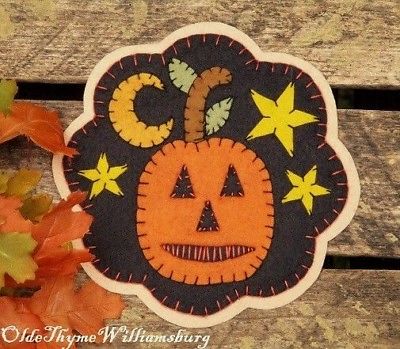 Title (ebay affiliate link): Primitive Stitchery HALLOWEEN Jack-O-Lantern & Stars Penny Rug ~ Wool Candle Mat