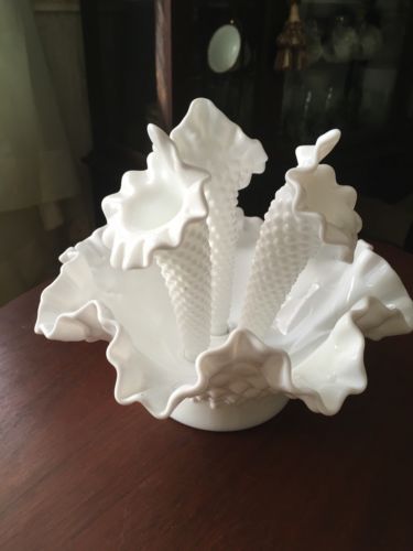 VINTAGE FENTON 3 FLUTE EPERGNE - WHITE HOBNAIL MILK GLASS