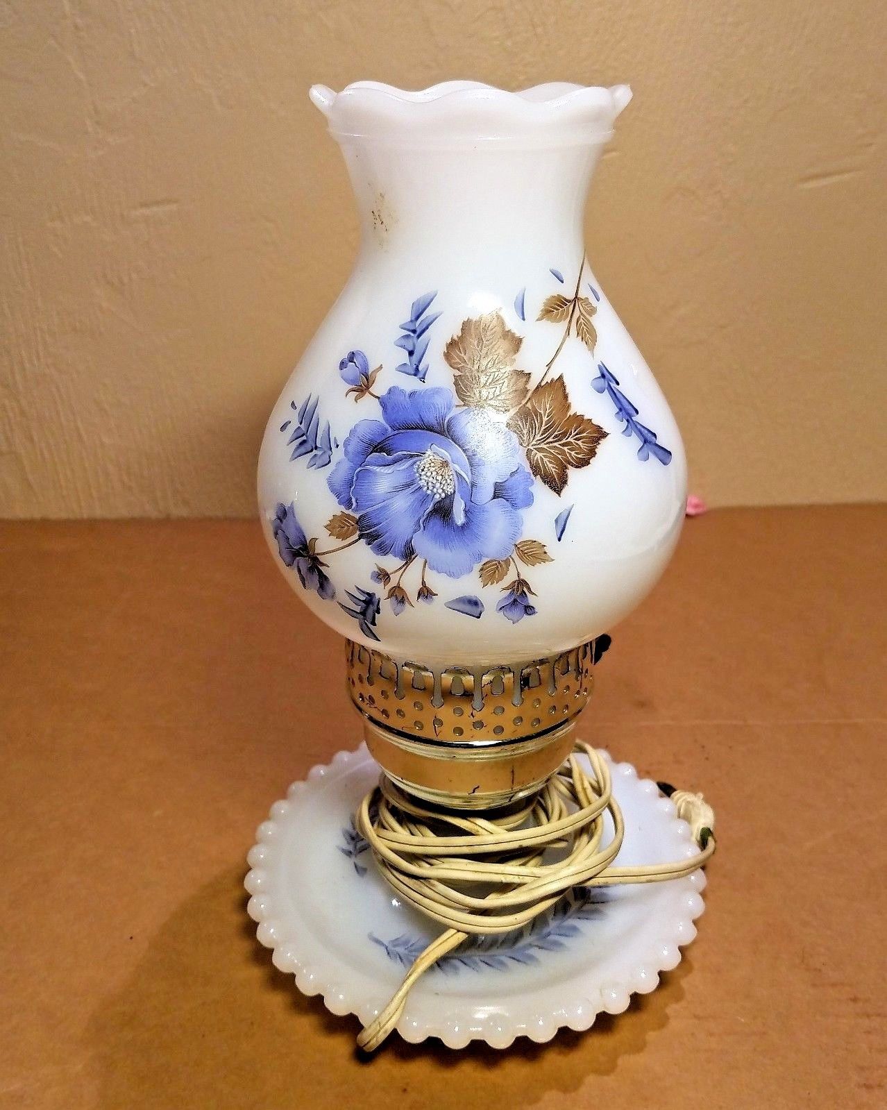 Title (ebay affiliate link): Vintage Milk Glass Hurricane Floral Table Lamp Bed Light Hand Painted