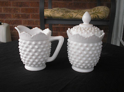 Title (ebay affiliate link): Fenton White Milk Glass Hobnail Handle Creamer And Lidded Sugar Bowl