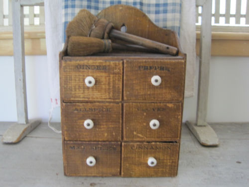 Title (ebay affiliate link): Old Antique Primitive Six Labeled Drawers Wood Spice Cabinet Signed on Back