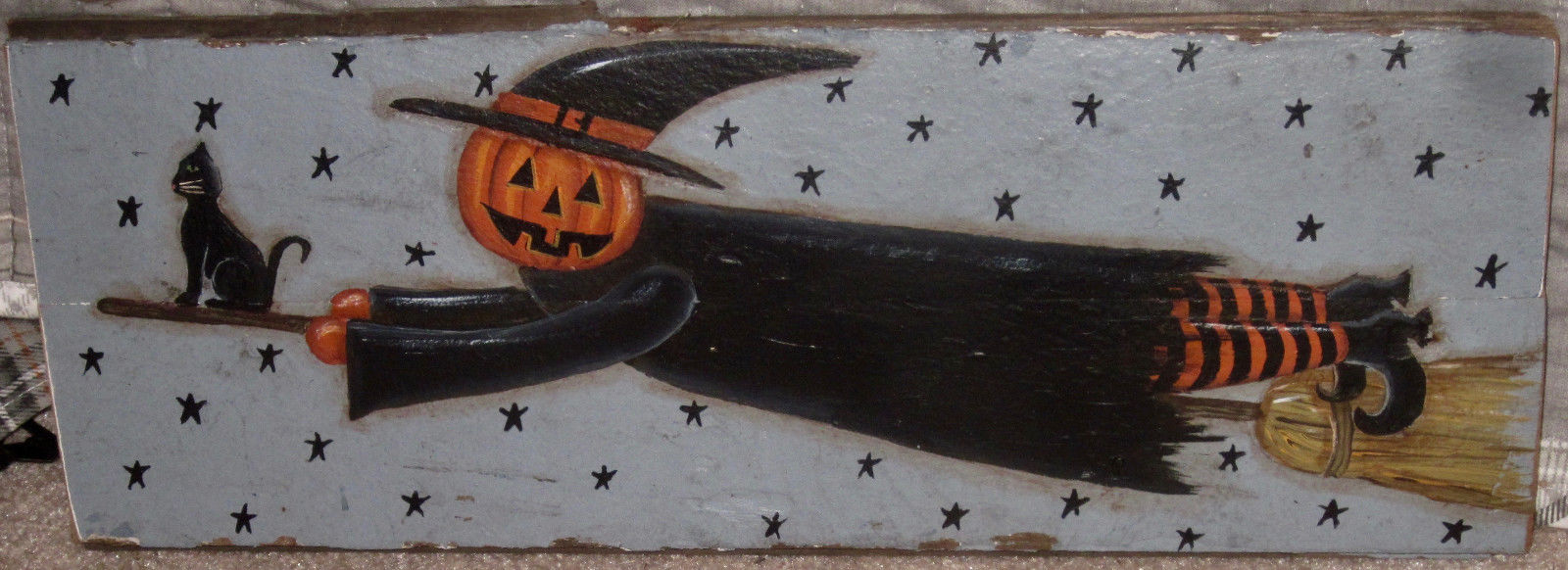 Title (ebay affiliate link): *~*PRIMITIVE*~* HP FOLK ART FLYING JACK-O-LANTERN WITCH * CAT *~* RECLAIMED WOOD