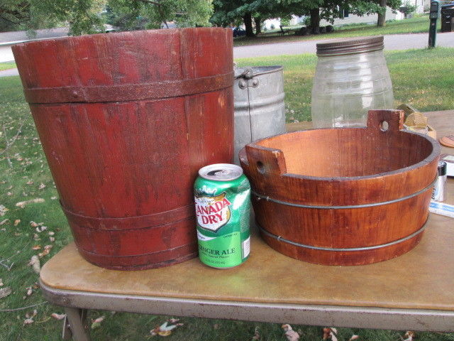 Title (ebay affiliate link): large firkin, 11 1/2 x 11 1/2". 3 metal bands, no handle. & small firkin