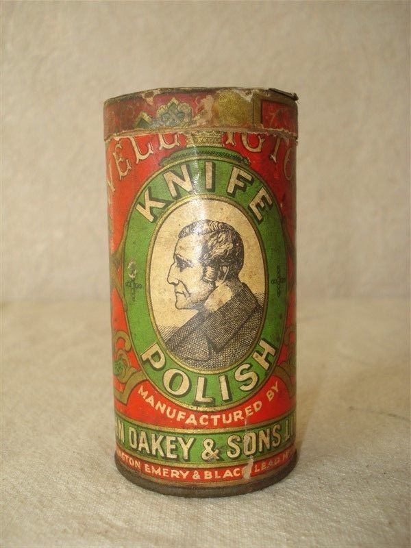 Title (ebay affiliate link): Vintage Antique John Oakey & Sons Tin with Knife Polish Powder Wellington London