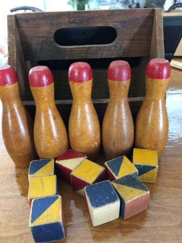 Title (ebay affiliate link): Vintage Toys~ 6 Wooden Mini Bowling Pins, 9 Wood Blocks ~Coca Cola Wood Box.