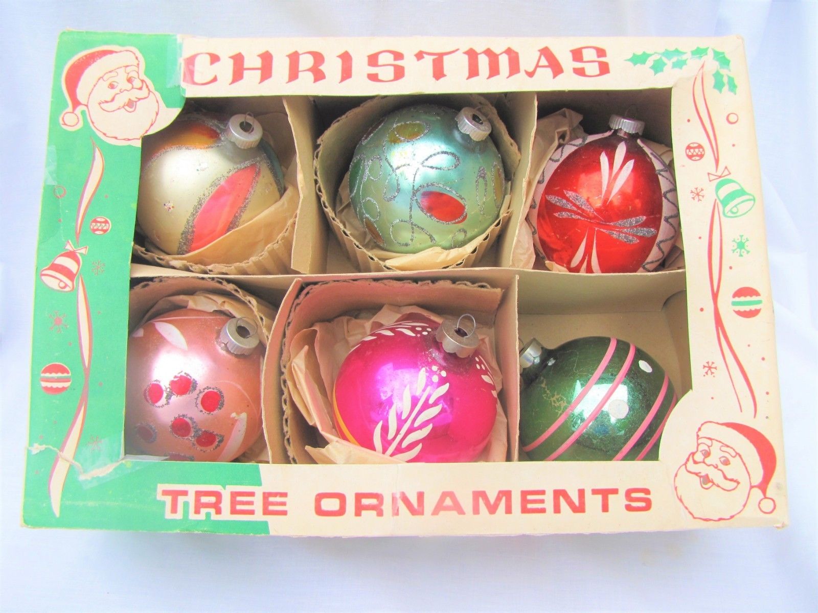 Title (ebay affiliate link): VTG JUMBO XMAS ORNAMENTS~SHINY BRITE GERMANY~W GERMANY~US OF A~IN BOX~GLITTER