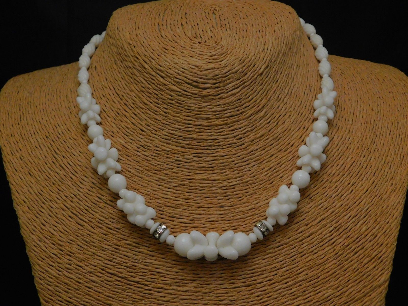 Title (ebay affiliate link): Antique White Milk Glass Carved Molded Ornate Beaded Necklace Rhinestone Accents