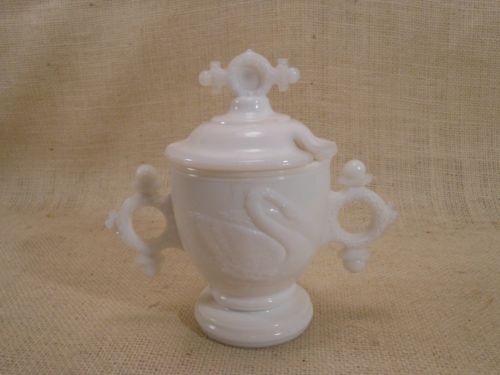 Title (ebay affiliate link): Antique Milk Glass Sugar or Jam Bowl, Swan Design, Double Handled with Lid