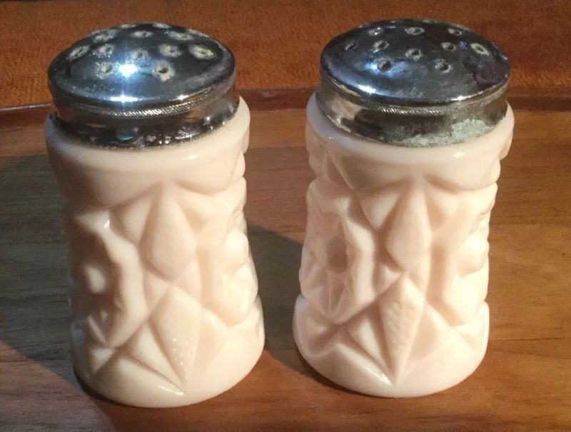 Title (ebay affiliate link): VINTAGE MILK GLASS PASTEL PINK SALT AND PEPPER SHAKERS RARE COLOR