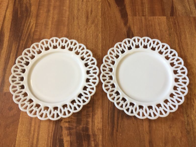 2 Vintage Milk Glass Laced Cross Plates 9.25â€