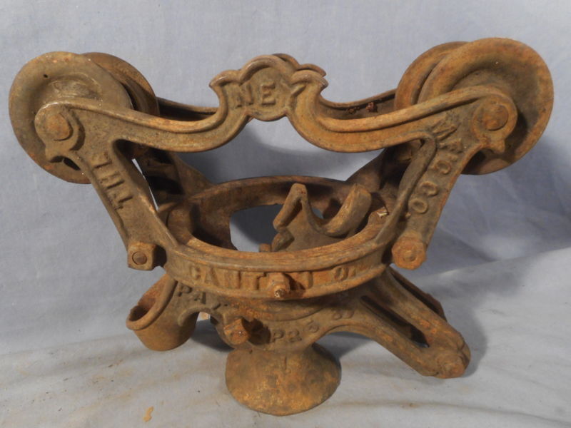 Title (ebay affiliate link): Antique Vintage Cast Iron Ney Mfg. Hay Trolley Pat. 1887 Farm Barn Pulley Tool