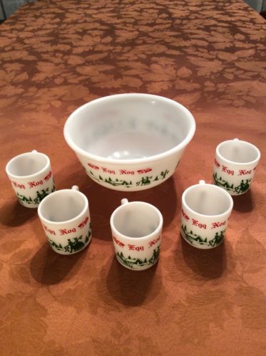 Title (ebay affiliate link): Anchor Hocking Egg Nog Bowl 5 Mugs Vintage Red And Green Milk Glass
